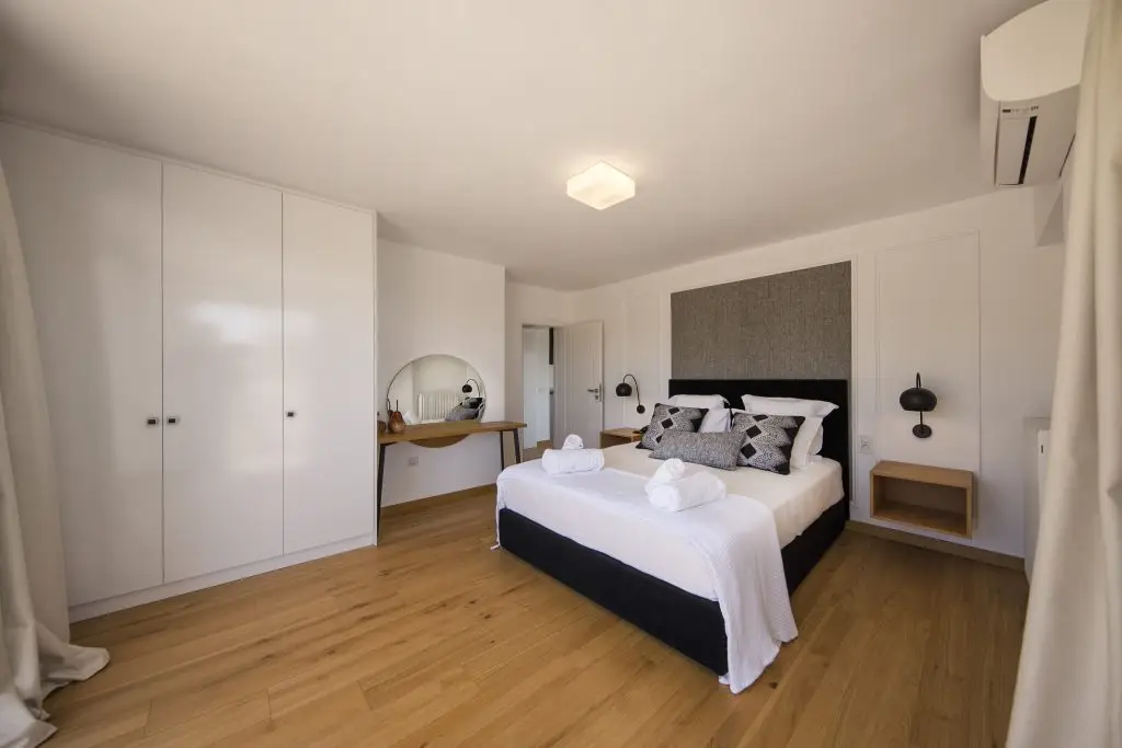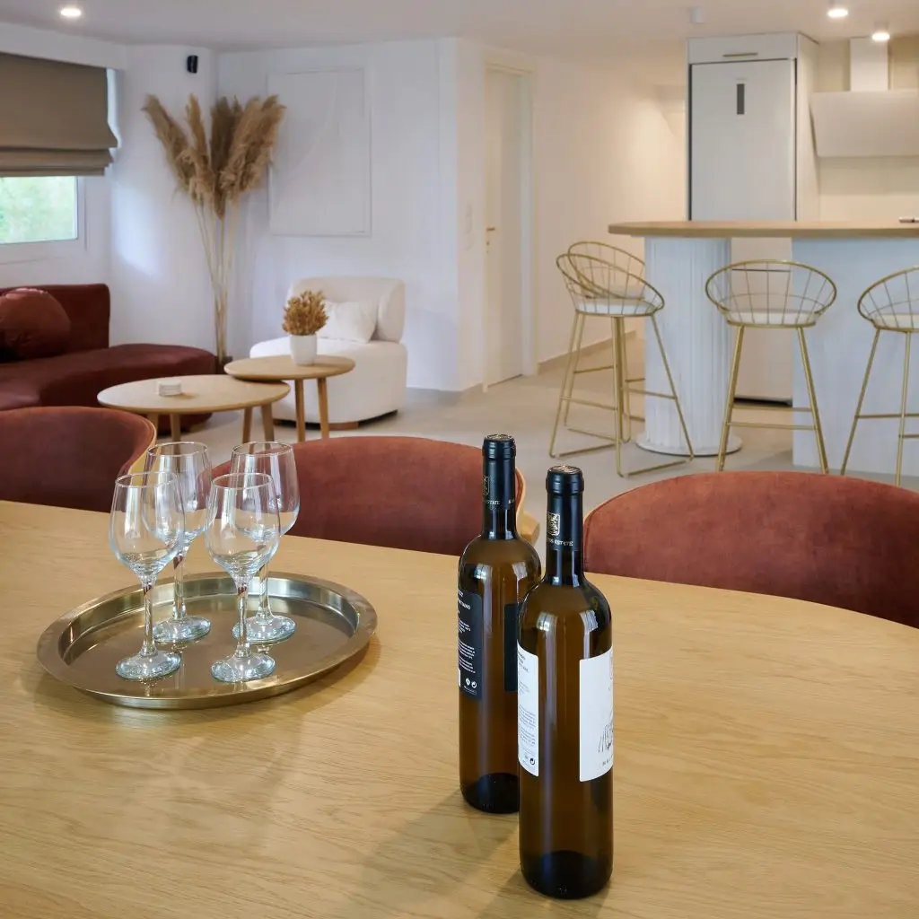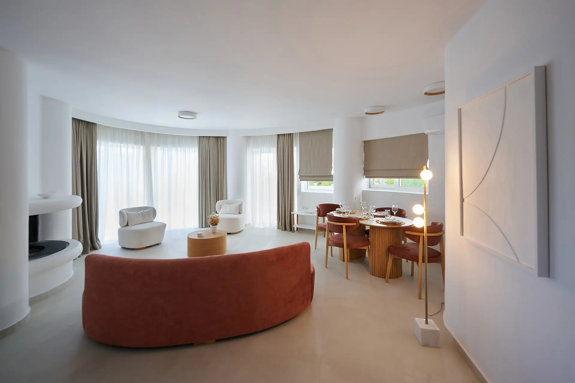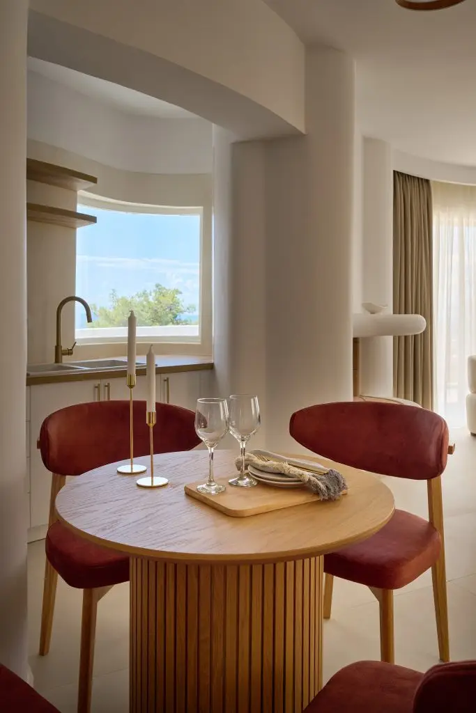The airy and expansive Scylla room showcases panoramic windows and refined decor, bathing the space in natural light and setting the stage for an unforgettable retreat.
