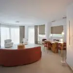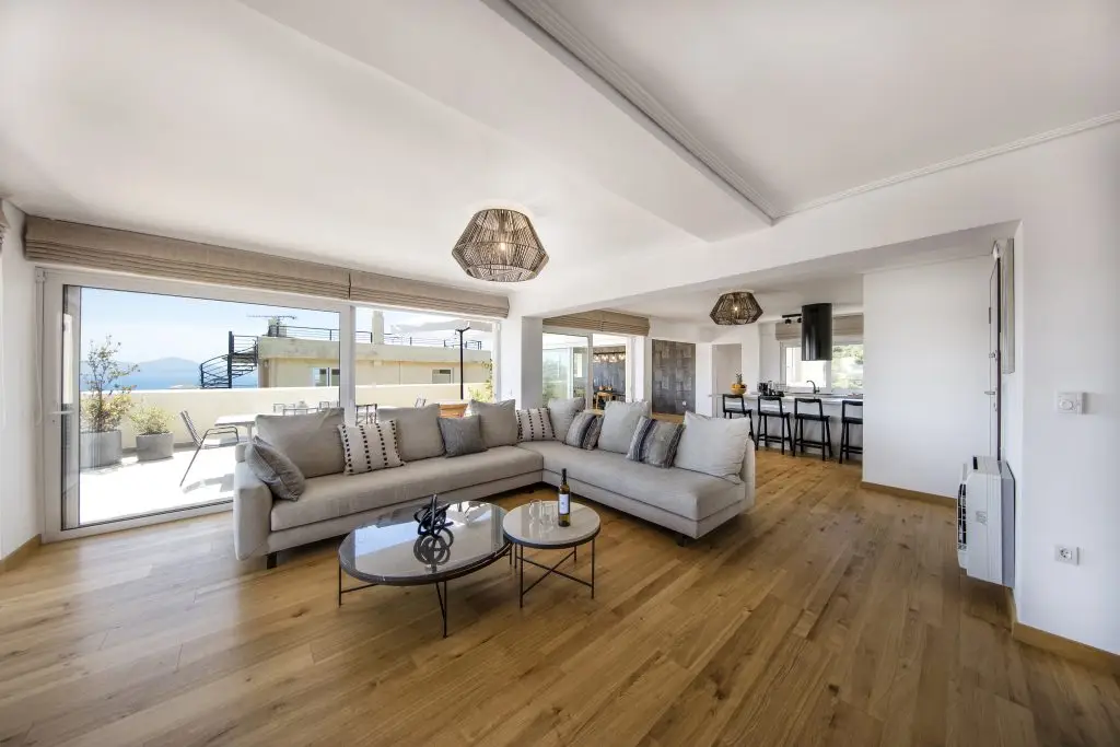 The Ithaca penthouse boasts sweeping windows and elegant decor, filling the spacious interior with sunlight and offering a stylish, serene retreat for an unforgettable getaway.